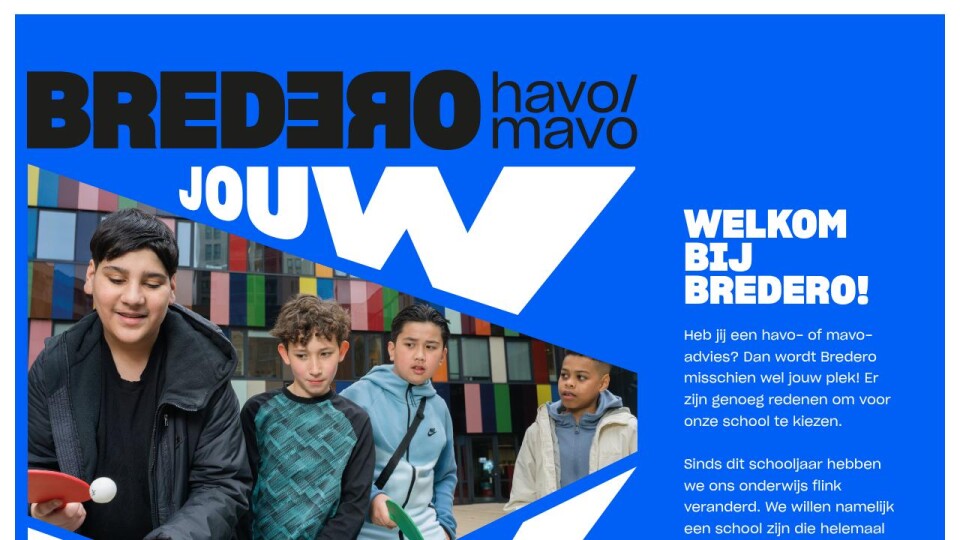 Sinds dit schooljaar hebben we ons onderwijs flink veranderd. Je komt bij ons in een driejarige brugperiode waarin je je rustig kunt ontwikkelen. Je stelt een ‘persoonlijke leerroute’ samen die goed bij jou past. Daarbij kun je verschillende niveaus en richtingen combineren. Je gaat echte opdrachten uitvoeren voor bedrijven en organisaties. Ook kun je vakken volgen die samen met het hbo en mbo worden aangeboden. Er is op Bredero volop uitdaging, je kunt van alles ontdekken, je wordt goed begeleid. Vanwege alle extra’s krijg je een diploma+.